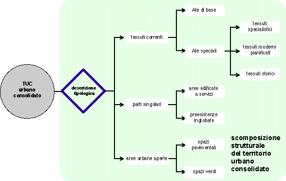 Diversamente dalle altre grandi classi, quella del territorio urbano consolidato (TUC) - che comprende i tessuti insediativi e le aree occupate dai servizi esistenti -, non dà luogo a sottoclassi. Infatti in questo caso il regime edificatorio non dipende dalle aspettative urbane, ma dalle caratteristiche del tessuto. Nel TUC il criterio dell'indice convenzionale di edificabilità (fondamentale nelle altre classi) ha importanza marginale: quello che qui prevale nettamente è infatti il criterio che è stato definito della "perequazione tipologica".