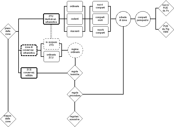 Come risulta dal presente schema, le zone sono differenziate a seconda del loro grado di operatività e del tipo di regole a cui sottostanno. Le destinazioni d'uso non entrano nella loro classificazione, ma piuttosto nelle singole schede di zona. Tuttavia abbiamo già osservato come le zone cedenti corrispondano in linea di massima alle zone omogenee F.
